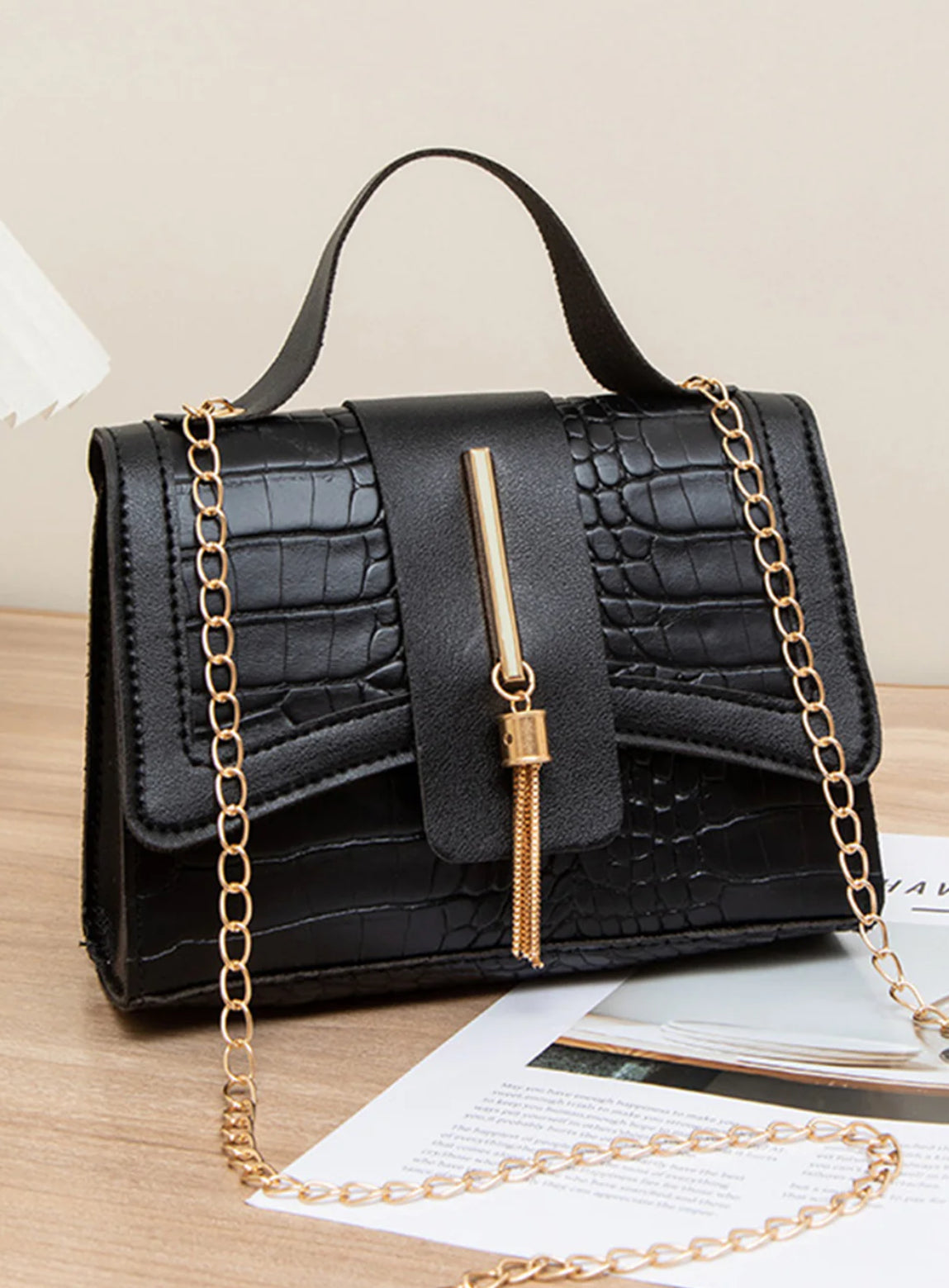 - Hardware: Polished gold-tone chain strap + statement tassel detail