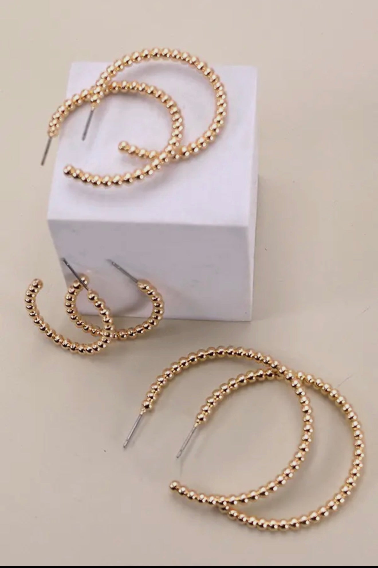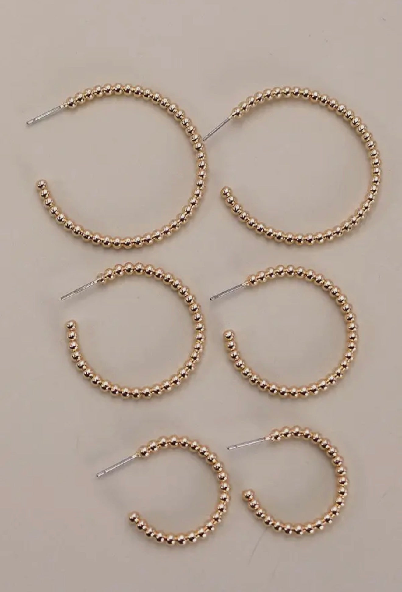 Step into your sparkle era with the Trendsetter Hoop Trio — a chic three-piece set designed for the girl who loves options. Featuring polished gold beaded hoops in small, medium, and large, this set gives you the perfect pair for every outfit, mood, and moment.