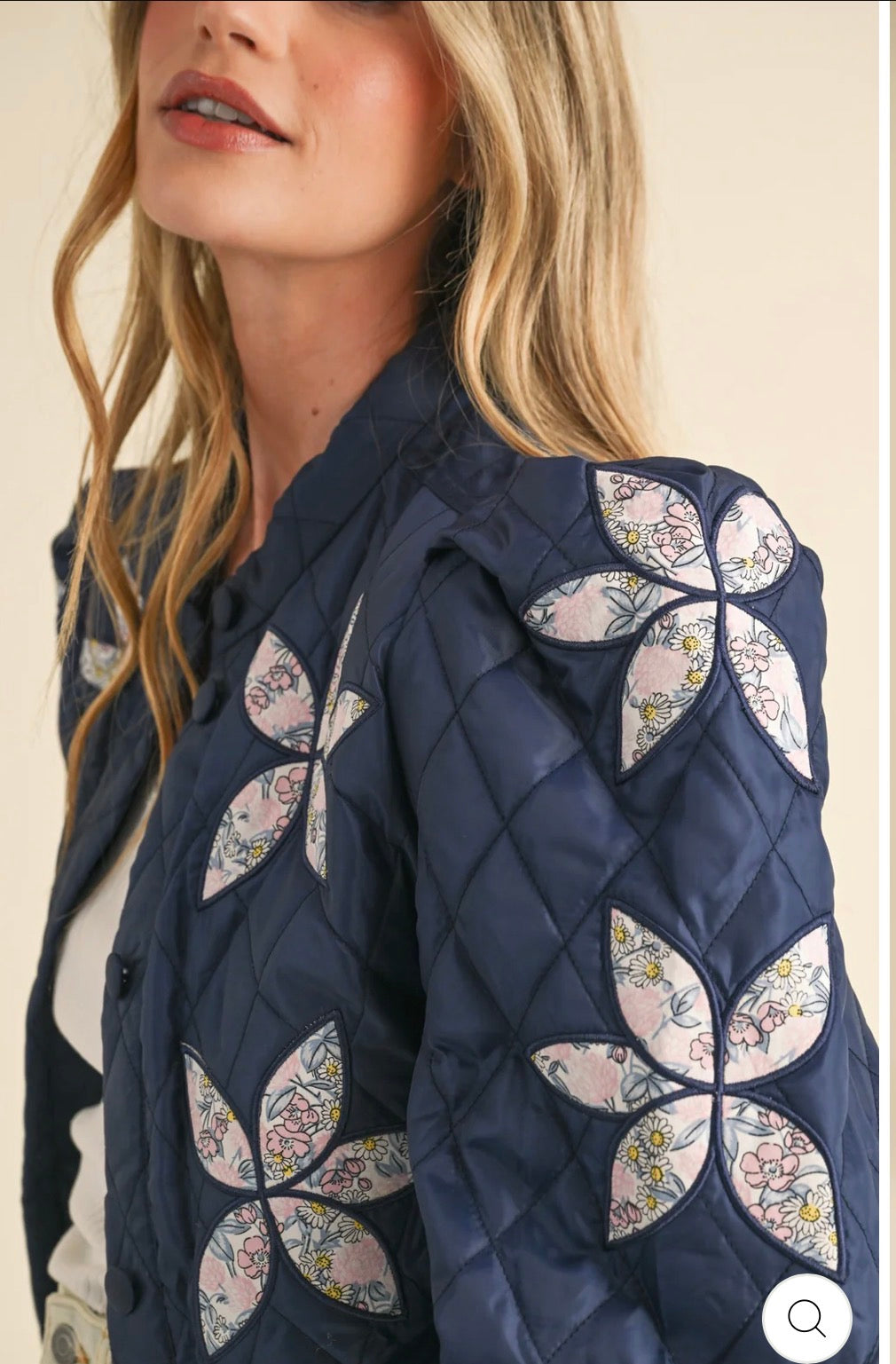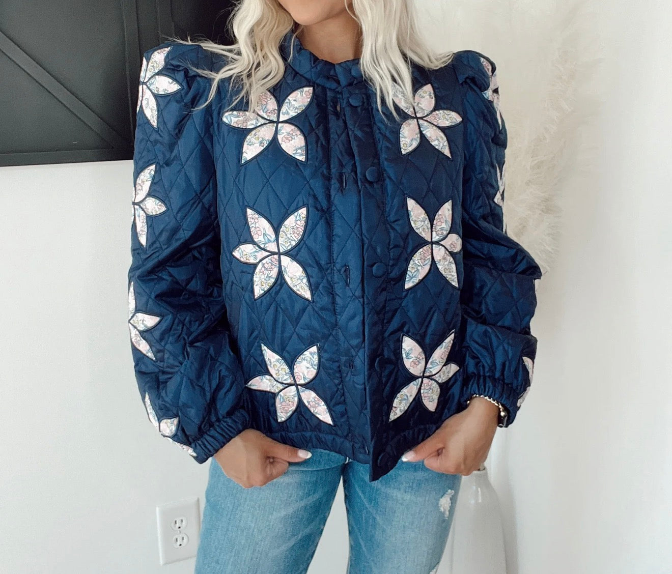 Say hello to the sweetest statement piece of the season — our Daisy Chain Quilted Jacket. This navy dream is quilted to perfection and adorned with the cutest floral appliqué petals, giving it a handcrafted, vintage-inspired charm that feels straight out of a storybook.