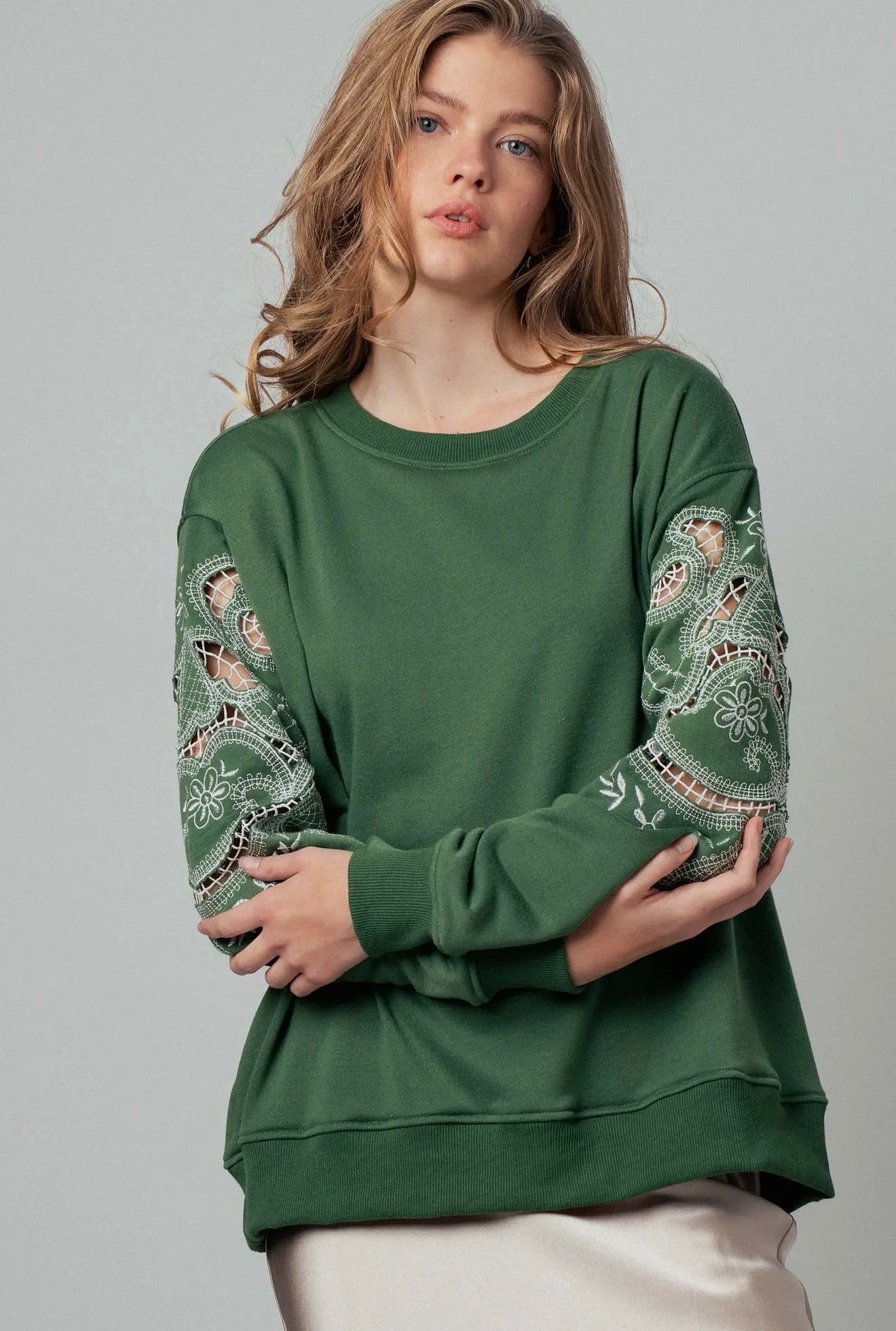 Meet Lacewood Charm, the pullover that blends cozy comfort with just the right touch of elegance. The stunning lace-cut sleeves add a dreamy, feminine detail that elevates any outfit, while the relaxed, slightly oversized fit keeps things easy, effortless, and oh-so-flattering.