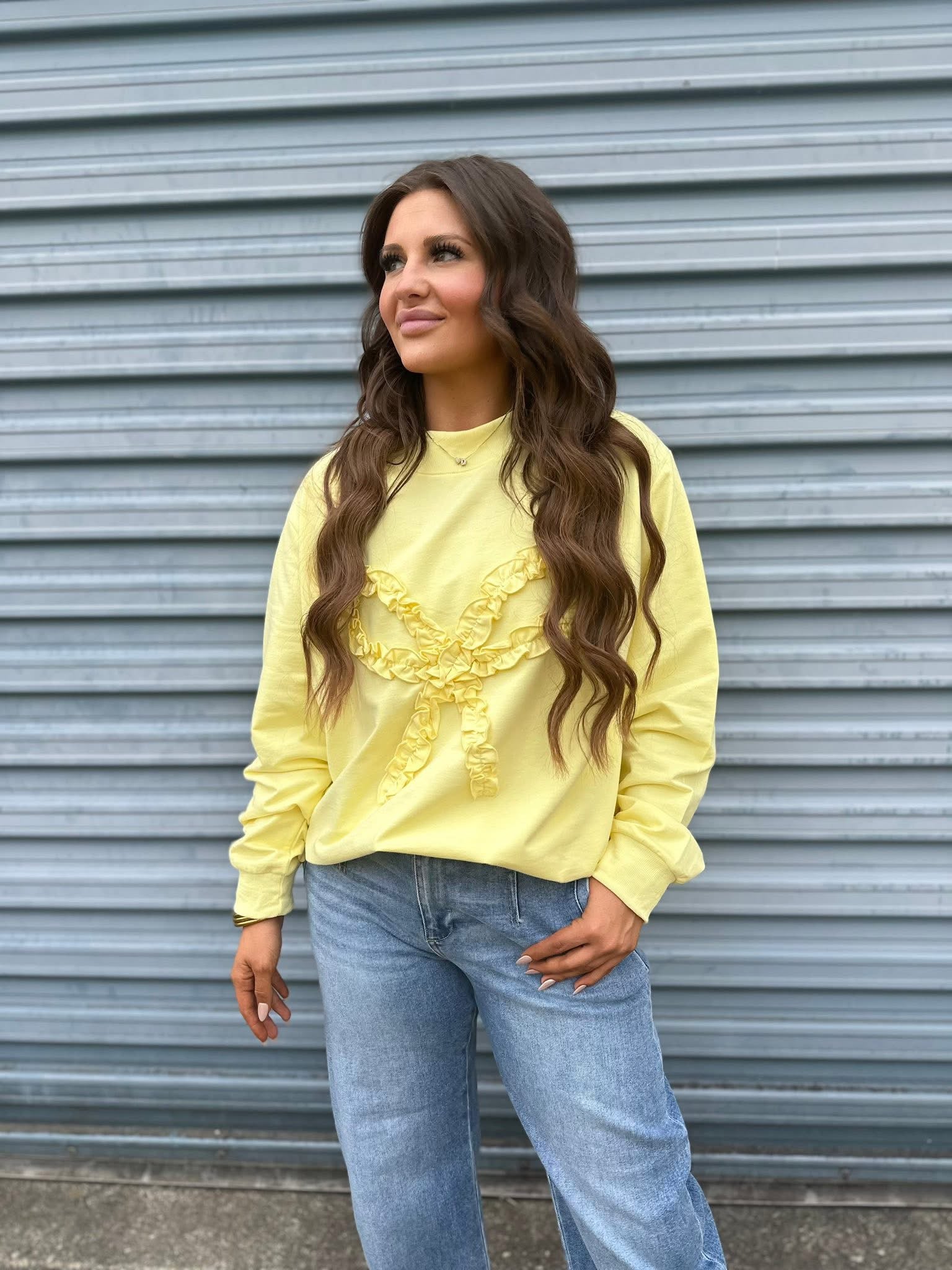 Bright, happy, and effortlessly feminine, our Sunny Days Ruffle Bow Top is the perfect feel-good piece for your everyday wardrobe. This soft lemon-yellow long sleeve features an eye-catching ruffle bow detail on the front, adding texture, charm, and just the right amount of sweetness.