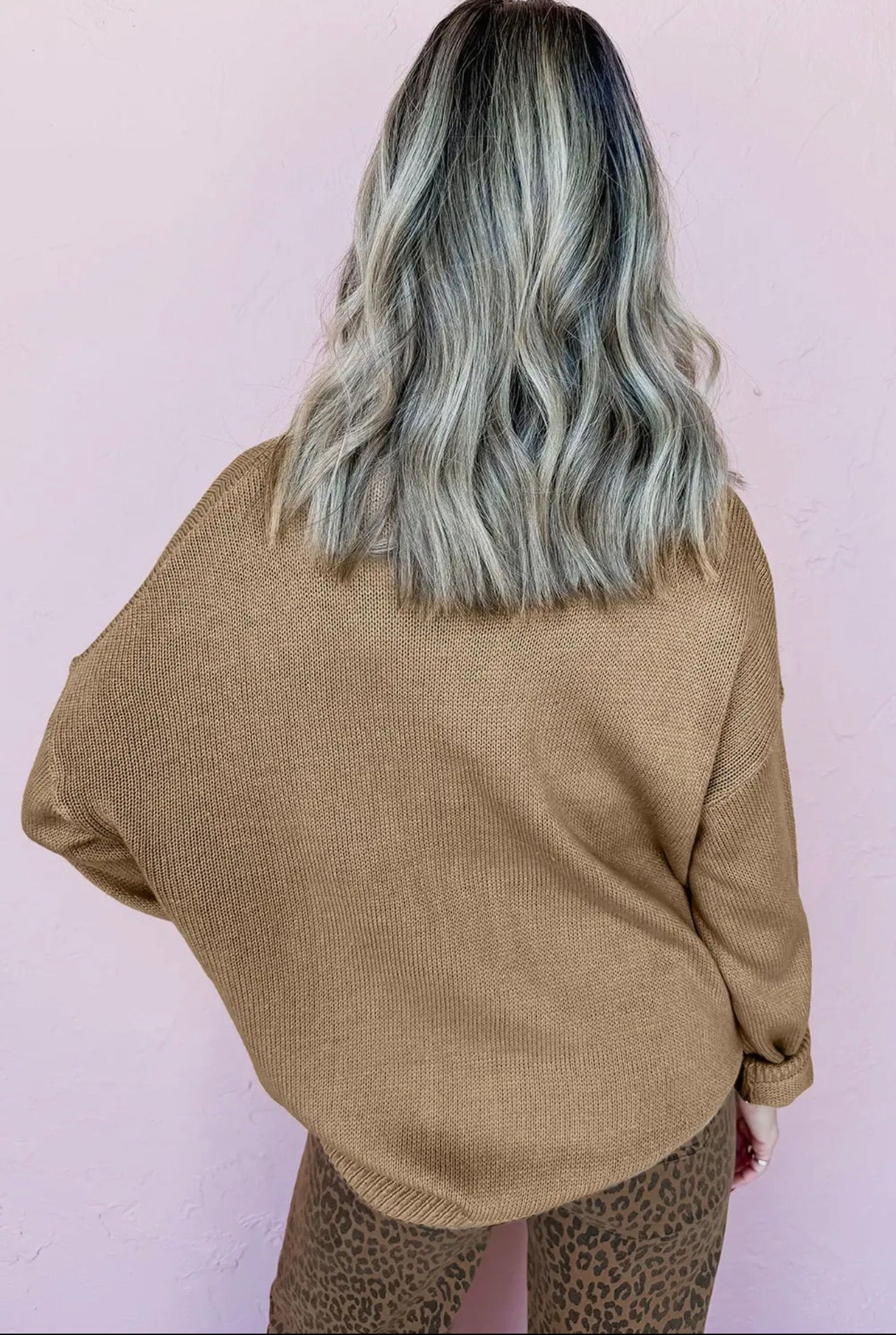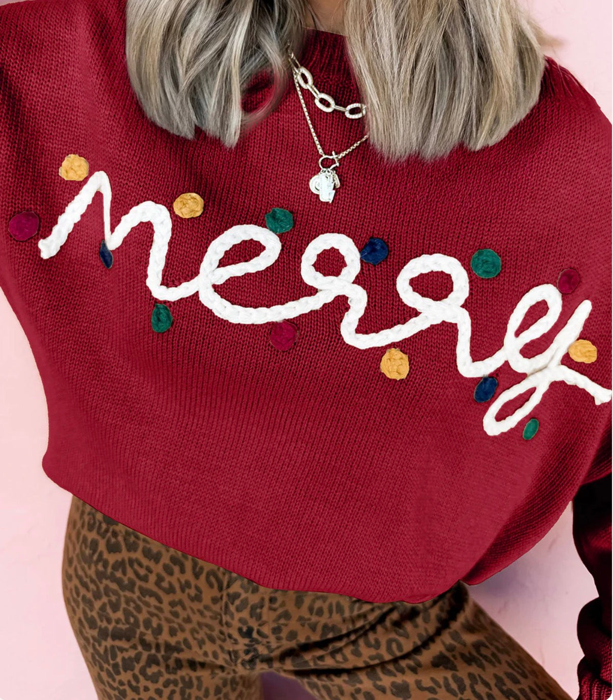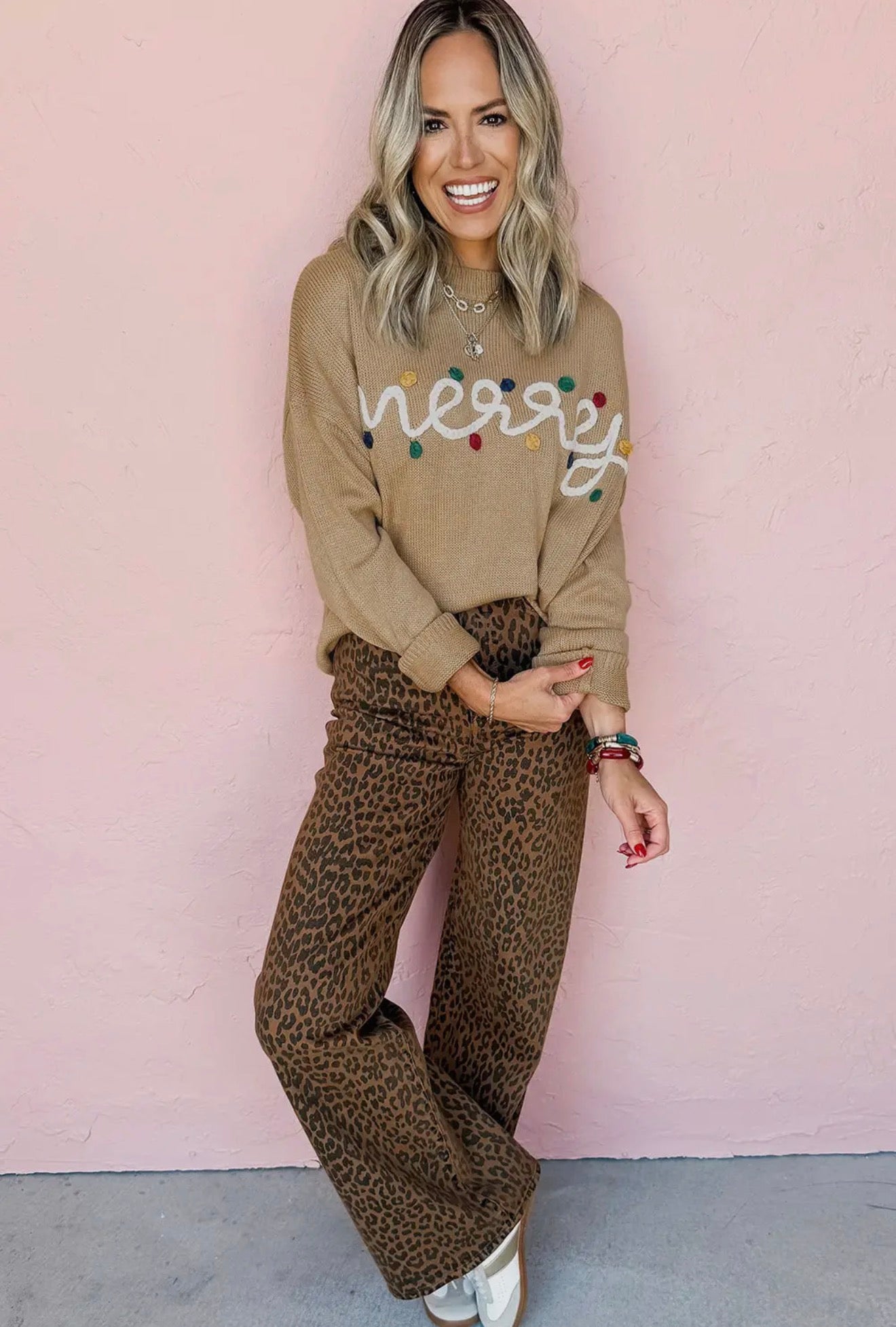 Celebrate the season in cozy style with our Merry & Bright Sweater! 🎄 This soft camel-tan knit features the word “merry” playfully stitched across the front in chunky white yarn, complete with colorful embroidered “lights” for the perfect touch of festive cheer. The relaxed fit and ribbed hem make it easy to front tuck or wear loose with your favorite jeans or leggings.